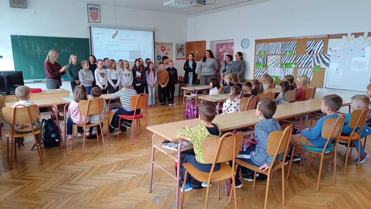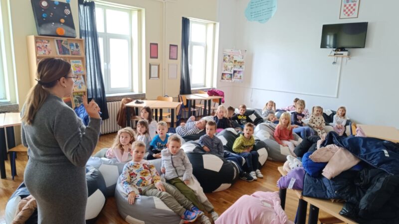 U sklopu Mjeseca hrvatske knjige Dječji vrtić Jesenje je organizirao posjet knjižnici Osnovne škole Gornje Jesenje za djecu iz vrtićke skupine “Vrgonjeki”. Djeca su razgledala prostore školske knjižnice, upoznala rad knjižničarke i slušala zanimljivu priču koju im je knjižničarka ispričala. Posjet je bio i lijepa prilika da se naši budući prvašići upoznaju s okruženjem škole i budućom razrednicom. Učenici četvrtog razreda sa svojom razrednicom i učiteljicom njemačkog jezika pripremili su nekoliko prekrasnih pjesmica koje su izveli ispred vrtićanaca. Susret je protekao u veseloj i prijateljskoj atmosferi, a djeca su s oduševljenjem pratila nastup učenika. Zahvaljujemo Osnovnoj školi Gornje Jesenje na gostoprimstvu i toplom dočeku. Ovakvi susreti su dragocjena prilika za poticanje čitanja, razvijanje radoznalosti i olakšavanje prijelaza u školu za naše najmlađe. Fotografije s posjeta dostupne su u galeriji.